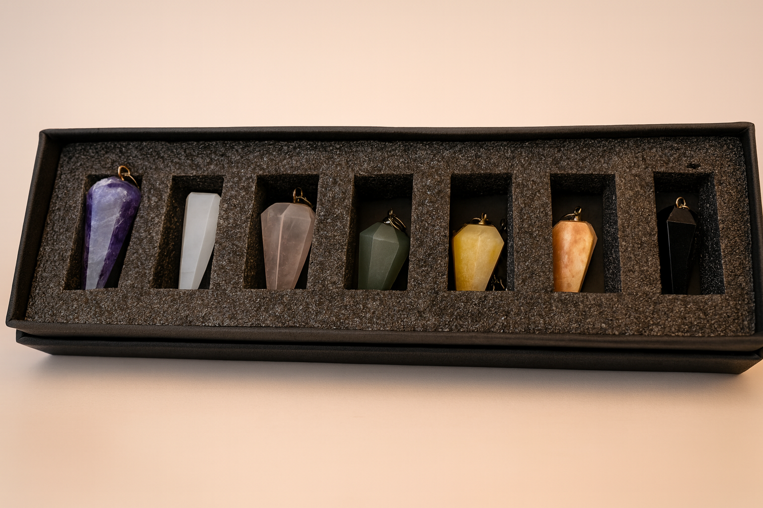Experience the power of crystal energy with our Natural Crystal Pendulum Set of 7 — a beautiful collection of genuine gemstones designed for balance, clarity, and healing. Each pendulum in this set is skillfully hand-carved and polished to perfection, ensuring both aesthetic beauty and energetic purity.